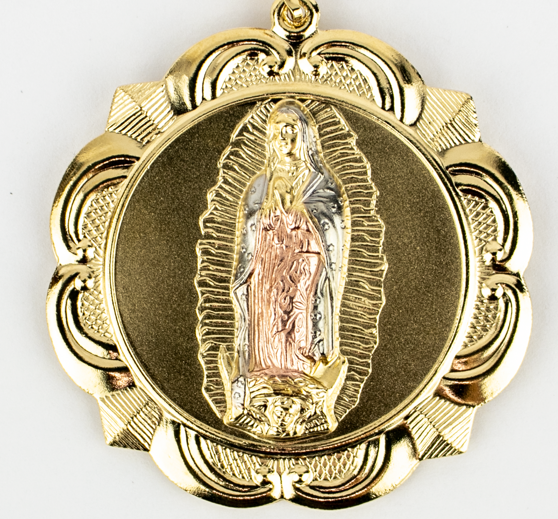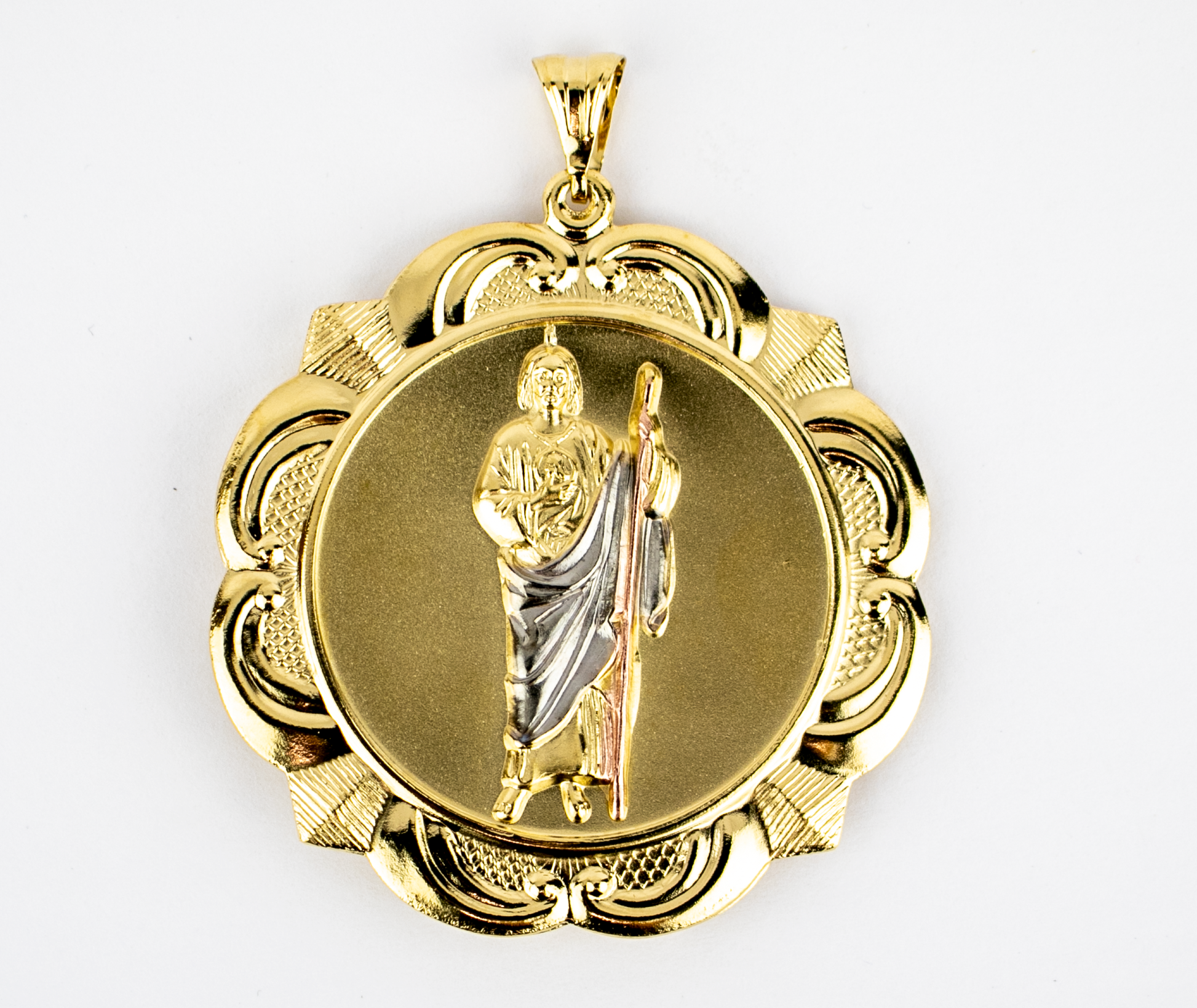 FLOWER SHAPE MEDAL SAN JUDAS & VIRGEN THREE COLORS, 2 1/2" made of 14 & 22 Karat gold filled and bonded over a heart of semiprecious metals.