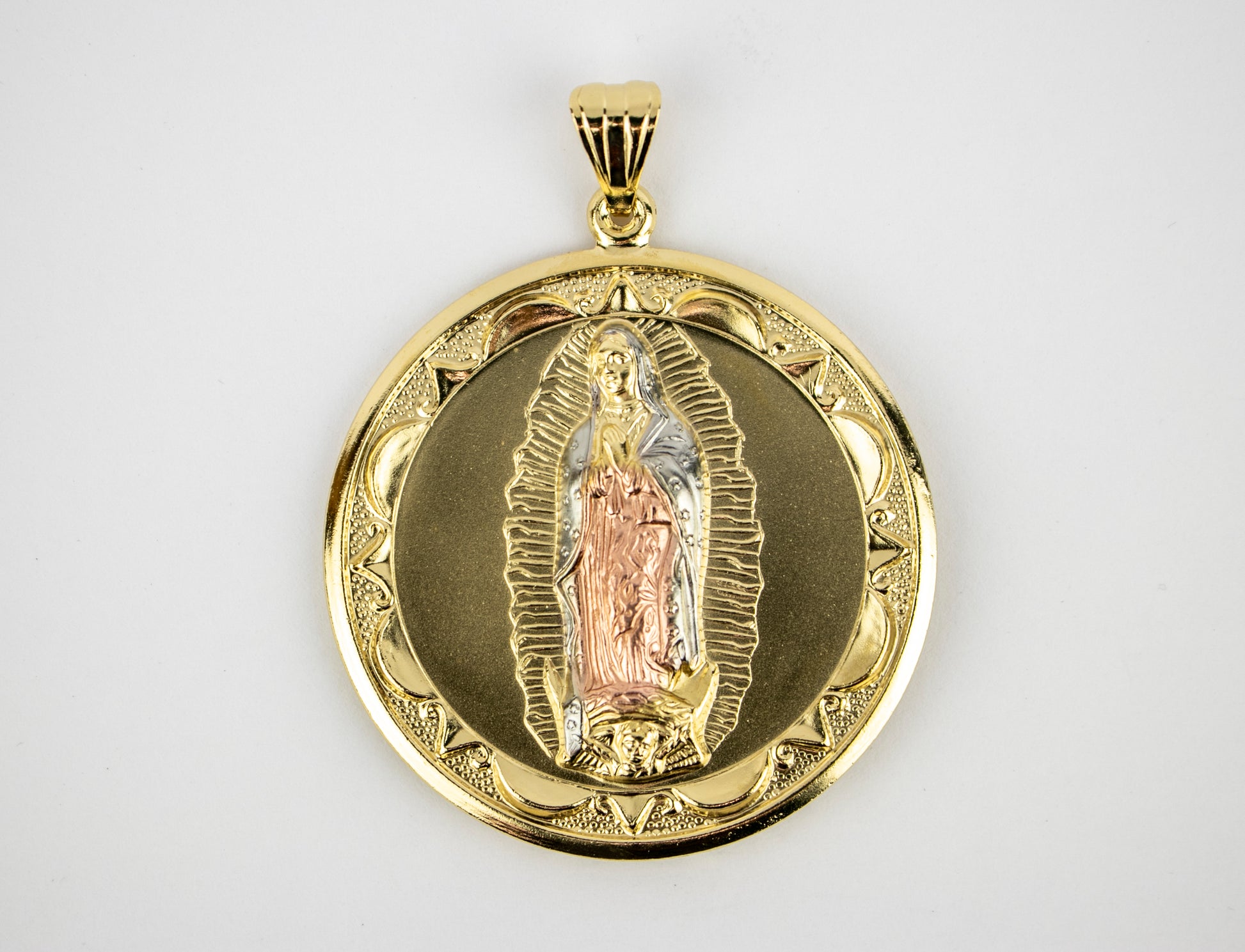 ROUND SHAPE MEDAL OF SAN JUAN DE LOS LAGOS/VIRGEN DE GUADALUPE THREE COLORS 2 1/2" made of 14 & 22 Karat gold filled and bonded over a heart of semiprecious metals.